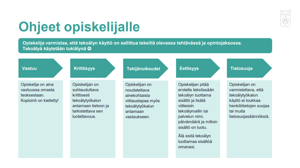 Turun kaupungin koko henkilöstöä varten on laadittu yleisiä ohjeita tekoälyn käyttöön liittyen. Ne löytyvät Metkusta.