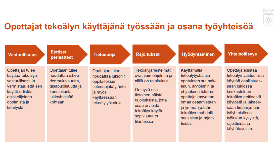 Ennen tekoälyn käyttöä opettajan on varmistettava, että käytettävät välineet ja toimintatavat ovat edellä lueteltujen velvoitteiden ja suositusten mukaisia.