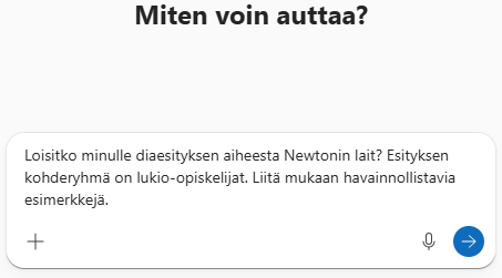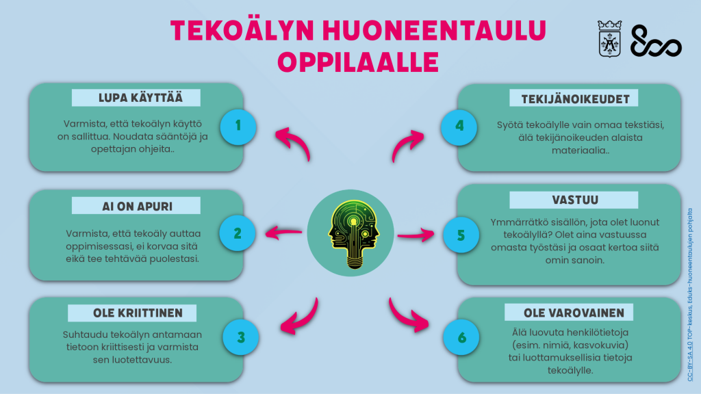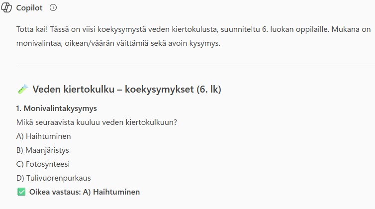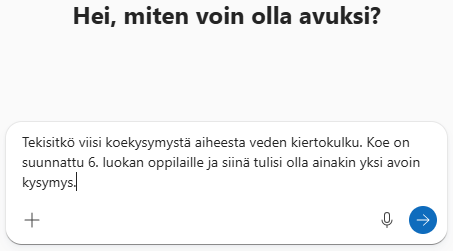Älä syötä tekoälylle henkilötietoja, salaisia tietoja tai oppilaiden vastauksia. Arviointi on opettajan vastuulla.