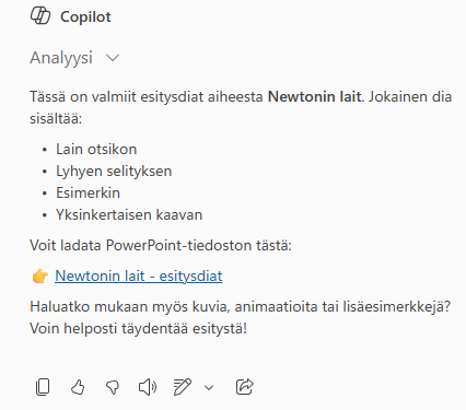 Käytössä on Copilot Chat, Adobe Express sekä AI- ominaisuuksia muissa sovelluksissa.