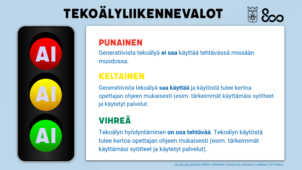 Mikäli generativiisen tekoälyn työkaluja on käytettävissä oppimisessa, opettajan kannattaa määrittää, milloin tekoälyn käyttö on sallittua ja milloin ei. Suosittu tapa kuvata asiaa on yksinkertainen liikennevalomalli.