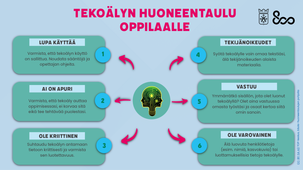 Turun kaupungin koko henkilöstöä varten on laadittu yleisiä ohjeita tekoälyn käyttöön liittyen. Ne löytyvät Metkusta.